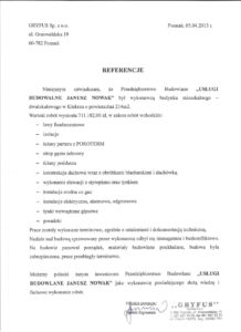 Usługi Budowlane Janusz nowak referencje P.W. TOMBUD T. Wicherek Jawik Sp. z o.o. Gryfus Sp. z o.o. Gryfus Sp. z o.o. DT Swiss Polska Sp. z o.o.